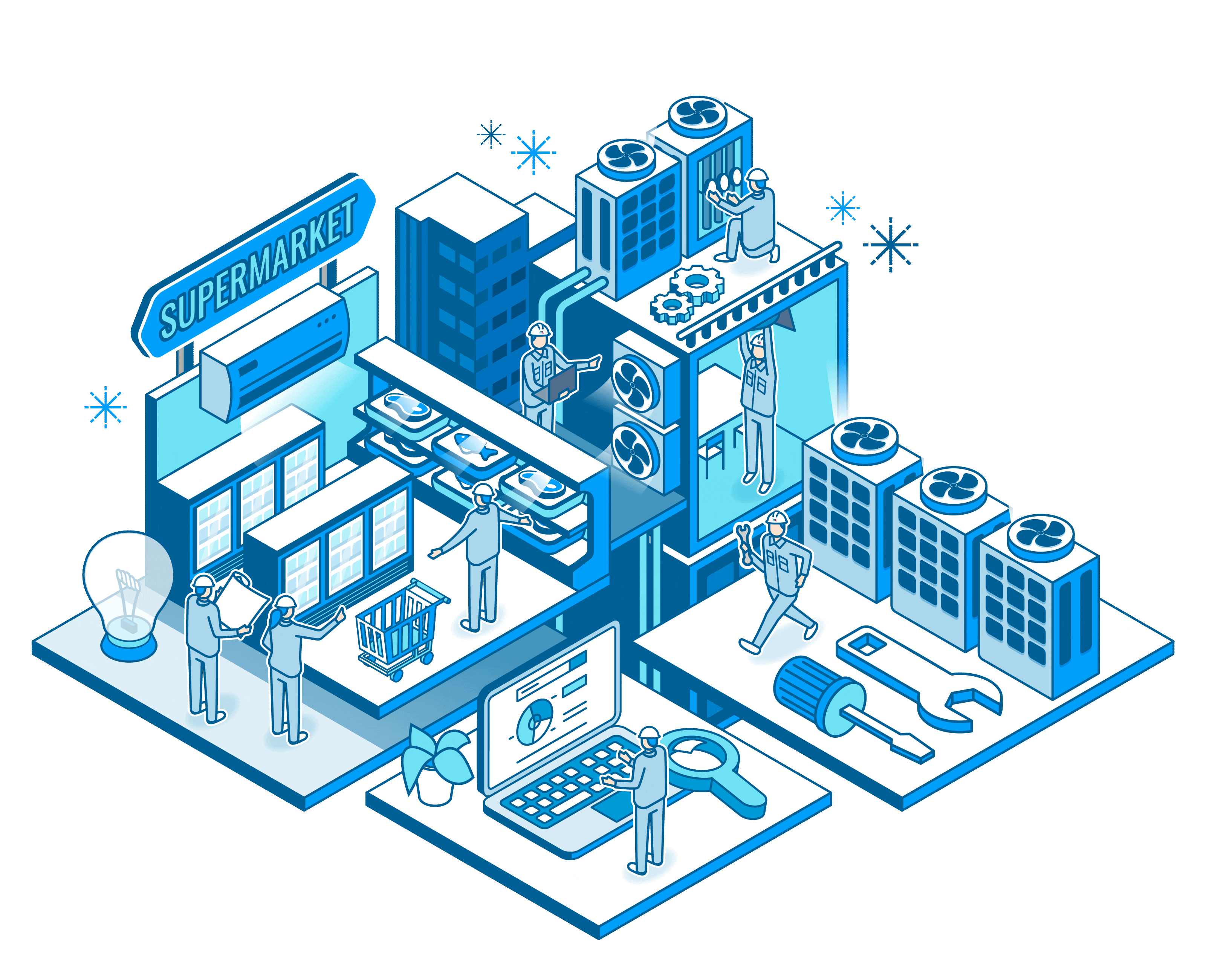冷機事業では人が入れる大型の冷凍冷蔵庫を組み立てたり、スーパーマーケット、ドラッグストアなどの店舗へショーケースを設置したりします。